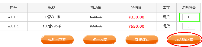 (四)、將需要訂購(gòu)的產(chǎn)品輸入訂購(gòu)數(shù)量后,點(diǎn)擊加入購(gòu)物車;