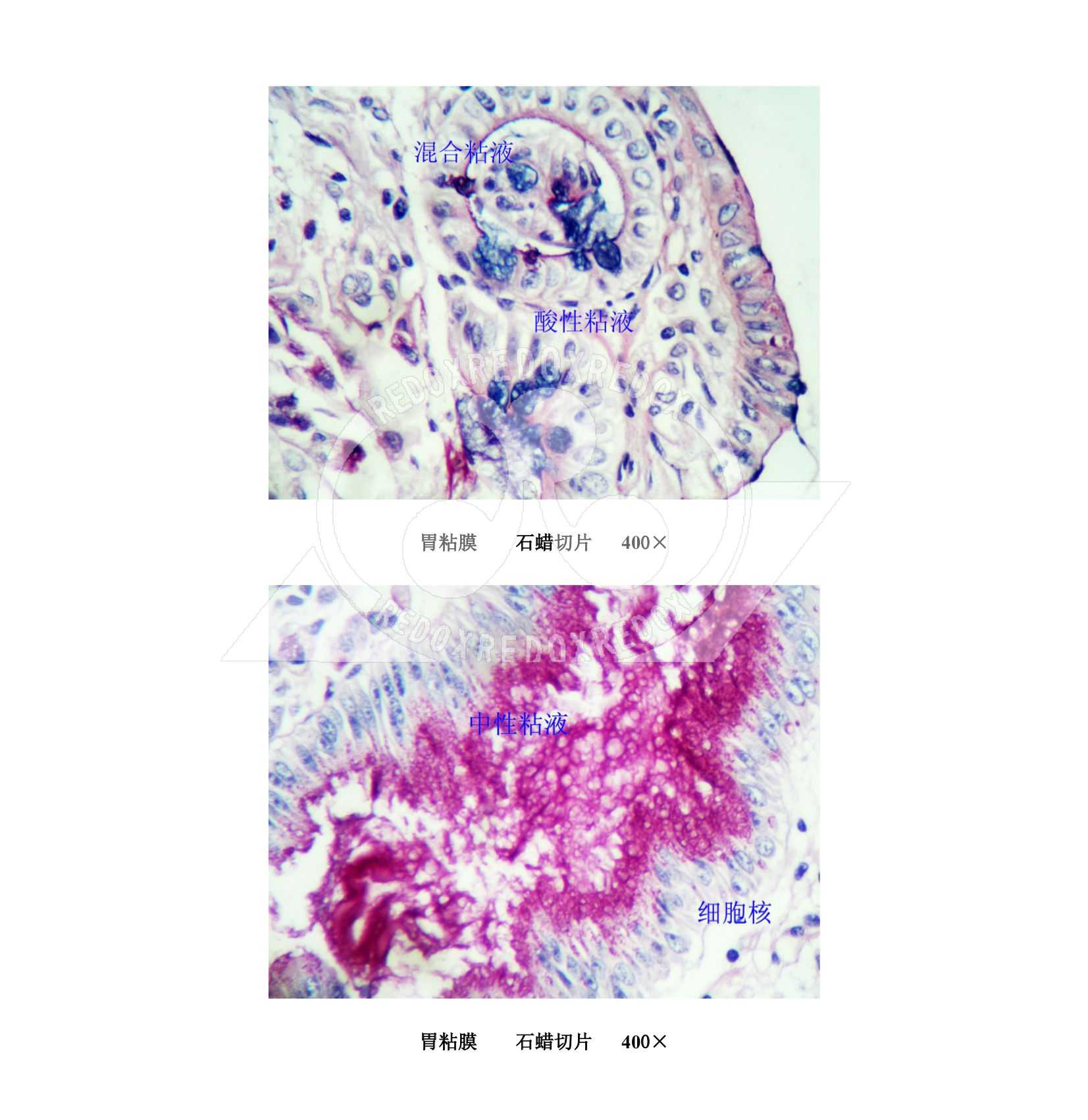 中性粘液物質含有氨基己糖基,酸性粘液物質也含有氨基己糖,并含有各種酸根。前者多見于胃粘膜的表面上皮,十二指腸腸腺、頜下腺和前列腺上皮等;后者多見于呼吸道和消化道的杯狀細胞、主動脈壁、軟骨基質、角膜和皮膚等。胃粘膜表面上皮分泌中性粘液,而胃的腸腺化生或腸型胃癌細胞分泌酸性粘液,但胃型胃癌的癌細胞則分泌中性粘液。這二種粘液在蘇木素-伊紅染色時較難區分,而用(AB-PAS)染色時酸性粘液可被愛先藍染為藍色,中性粘液則可被PAS染為紅色。