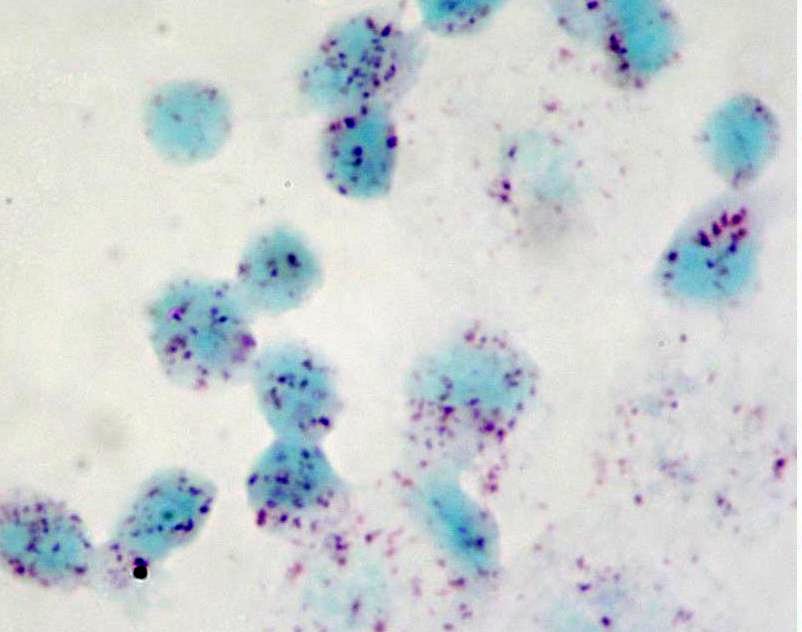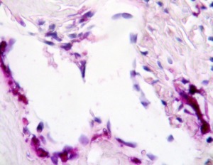 【染色結果】陽性反應為鮮紅色或深紅色顆粒,定位胞漿。